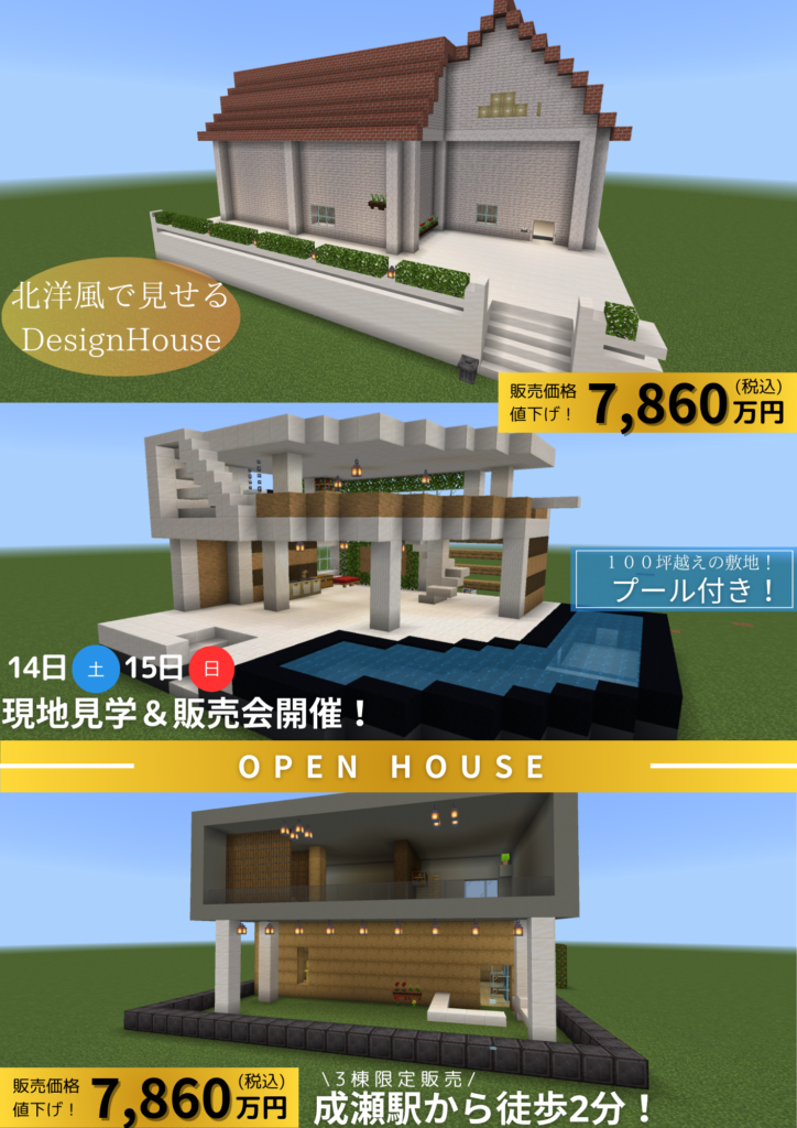 建築をして完成➡終わりではなく、このようにチラシ広告のように販売価格や日付など入れ、不動産会社が販売をしているような作りを見せることでイメージを膨らませます。